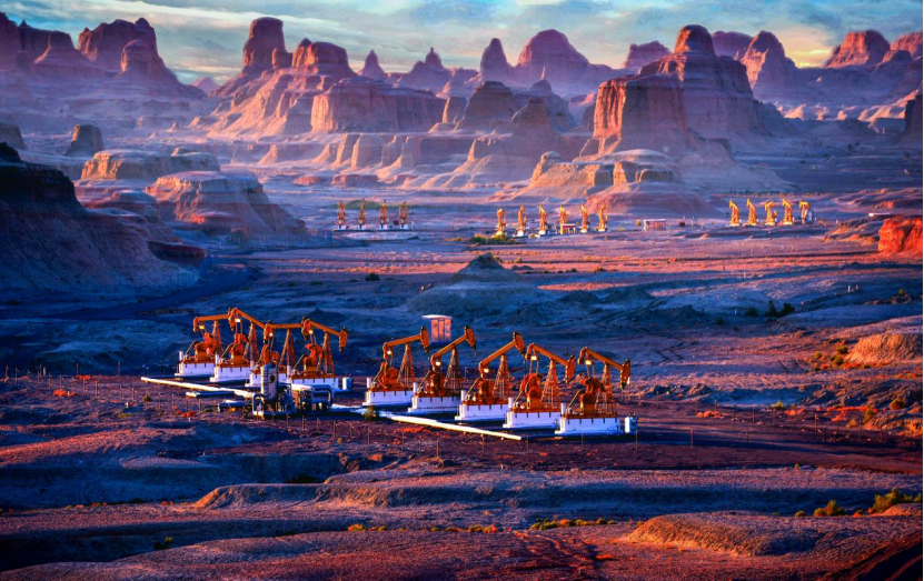 图为克拉玛依油田生产与克拉玛依世界魔鬼城景区交相辉映,成为一道独特的风景线。谭永生摄